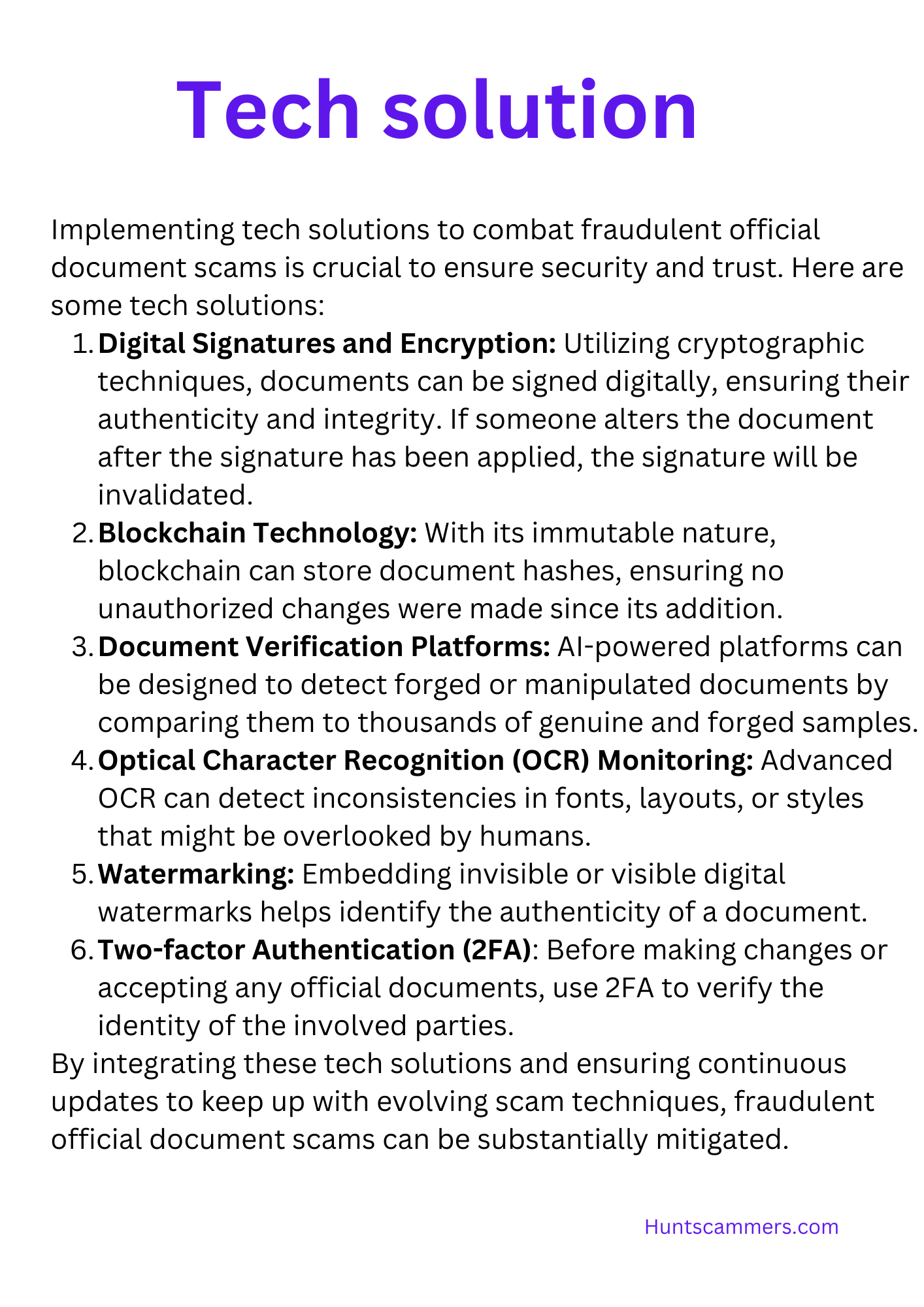 Exploring technological innovations that can help detect and prevent fraudulent documents. In the digital age, as fraudulent document scams rise in sophistication, technological innovations have emerged as potent tools for detection and prevention. Advanced solutions, ranging from machine learning scanners to blockchain verifications, are paving the way for enhanced security. Platform HuntScammers.com play a pivotal role in this defense, offering free scam prevention awareness to users. Additionally,our scam checker tool, available at Scam Checker Tools serves as a frontline resource, allowing users to swiftly verify and debunk potential scams. By leveraging technology and maintaining vigilance, we can fortify our defenses against deceptive practices.
