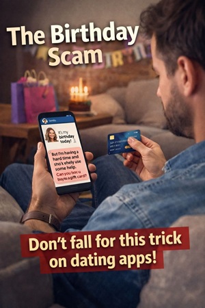 One dating scam that appears to be becoming more common is the birthday scam. In this situation, the scammer will chat with you for several weeks, gradually building trust and familiarity. Eventually, she will mention—almost casually—that her birthday is coming up soon.
