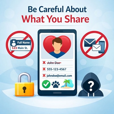 Most dating platforms allow you to register using just a first name or username, giving you control over how much personal information is visible. While it’s perfectly fine to share interests like enjoying the outdoors or loving pets, avoid revealing sensitive details. Never include your full name, phone number, email address, or home location in your profile or username, as this information can be misused by scammers.